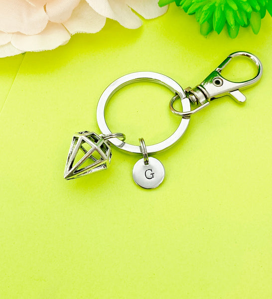 This is a silver-tone diamond shaped charm with hand stamped initial charm on keyring.