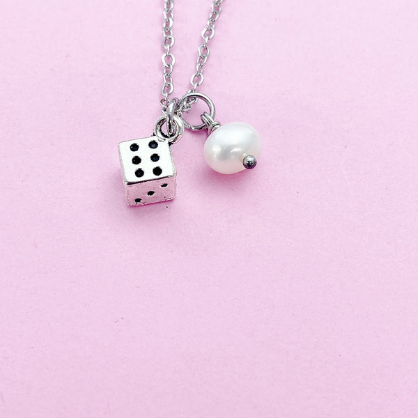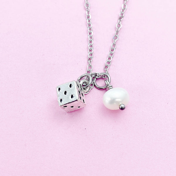This is a silver-tone dice charm with white pearl on stainless steel necklace.