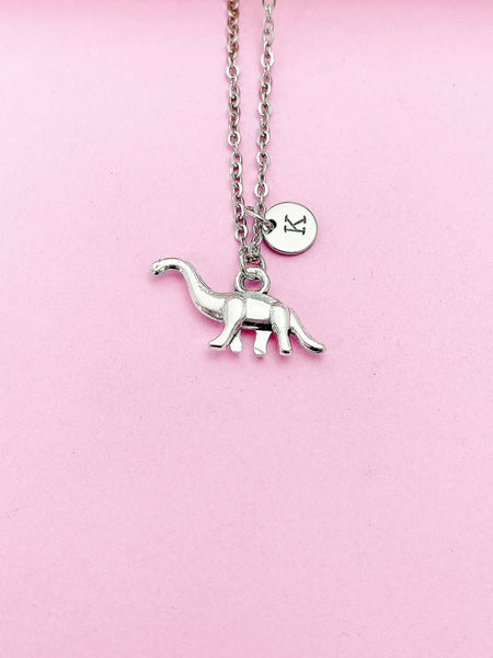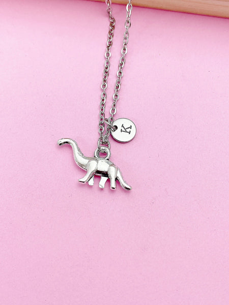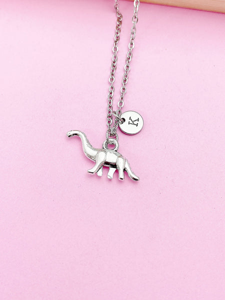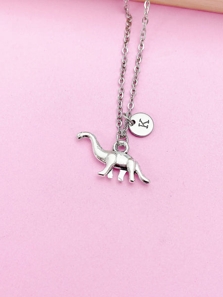 This is a silver-tone dinosaur charm with hand stamped initial charm on stainless steel chain.