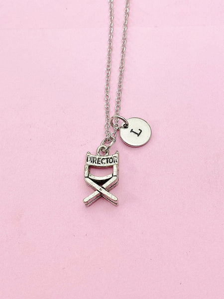 This is silver tone director chair charm with hand stamped initial charm on brass or stainless-steel chain.