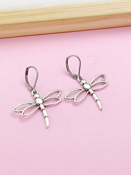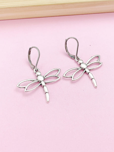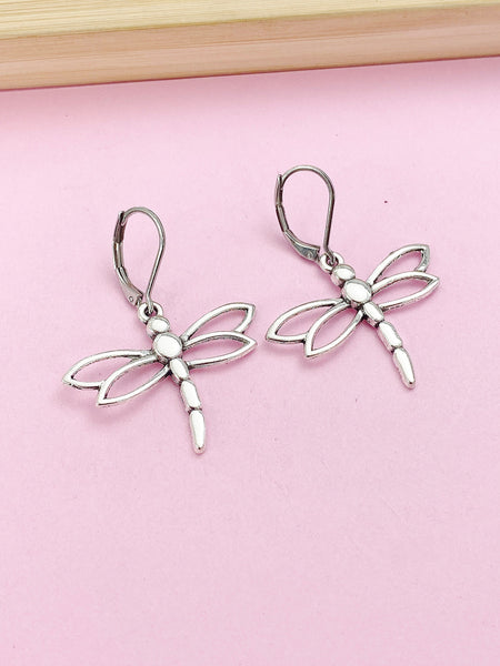This is a silver - tone Dragonfly charm on Stainless Steel Lever back Earring Findings.
