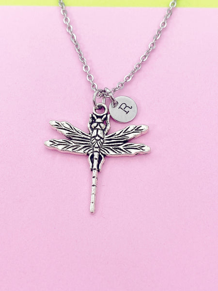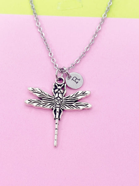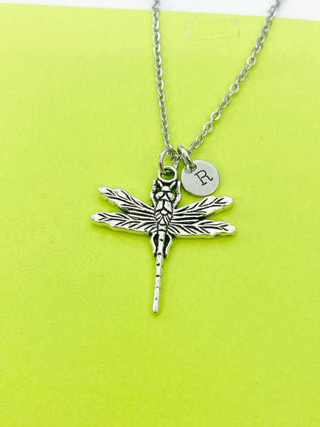 This is silver tone dragonfly charm with hand stamped initial charm on stainless steel 18 inches chain.
