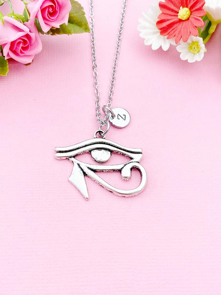 This is a silver-tone Egyptian Eye charm on brass or tarnish resistant stainless-steel chain.