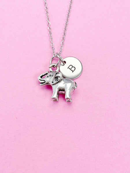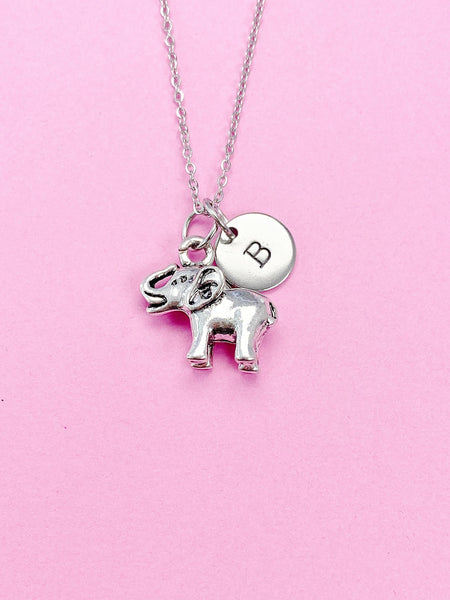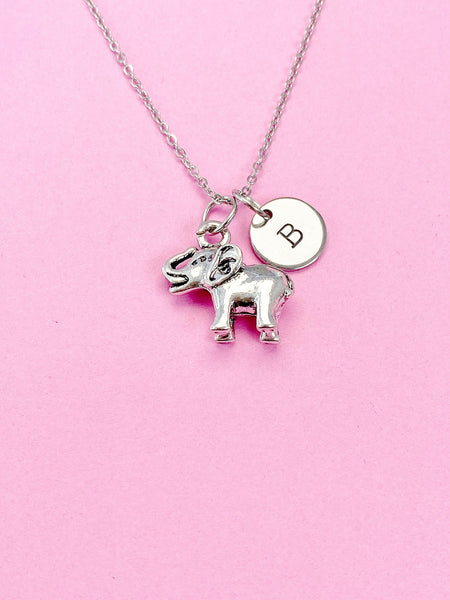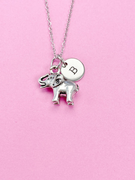 This is a silver-tone elephant charm with hand stamped initial charm on tarnish resistant stainless-steel chain.