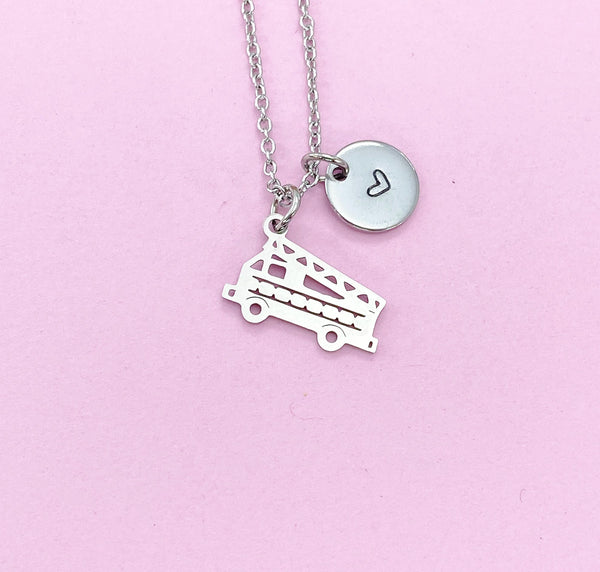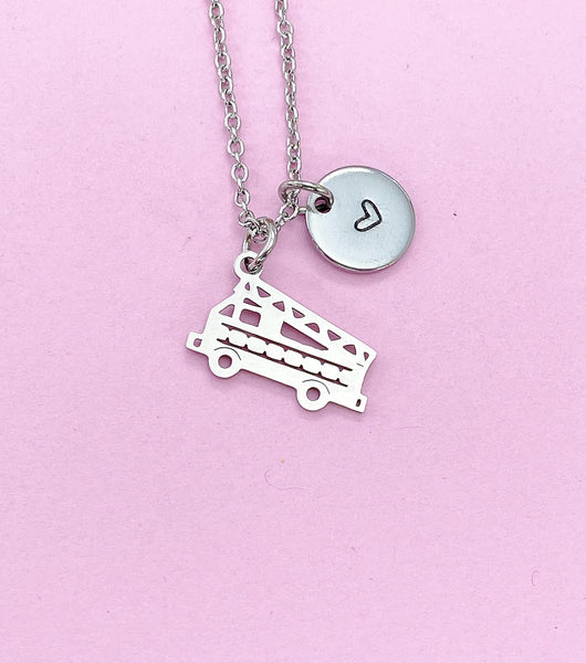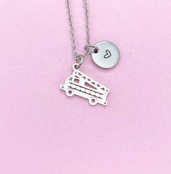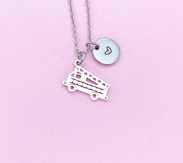 This is a stainless-steel or gold-plated fire truck charm with hand stamped initial charm on tarnish resistant stainless-steel chain.