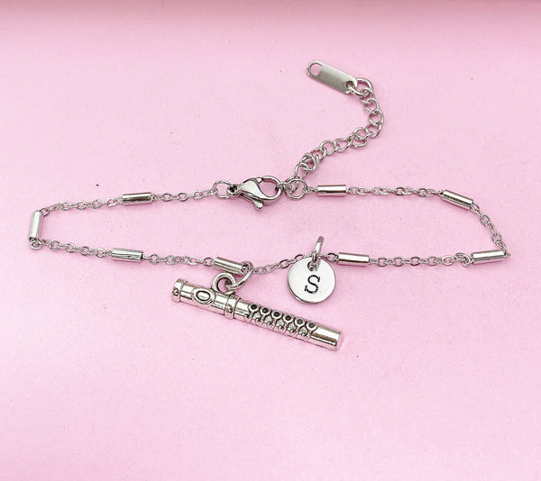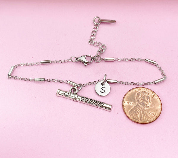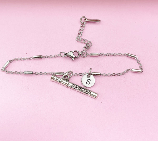 This is a silver-tone flute charm with hand stamped initial charm on tarnish resistant stainless-steel chain.