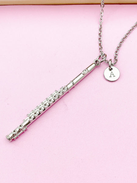 This is a silver-tone flute charm with hand stamped initial charm on brass or tarnish resistant stainless-steel chain.