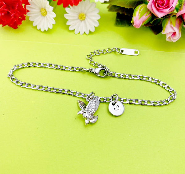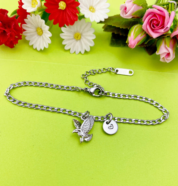 This is a silver-tone eagle charm with hand stamped initial charm on stainless steel bracelet.