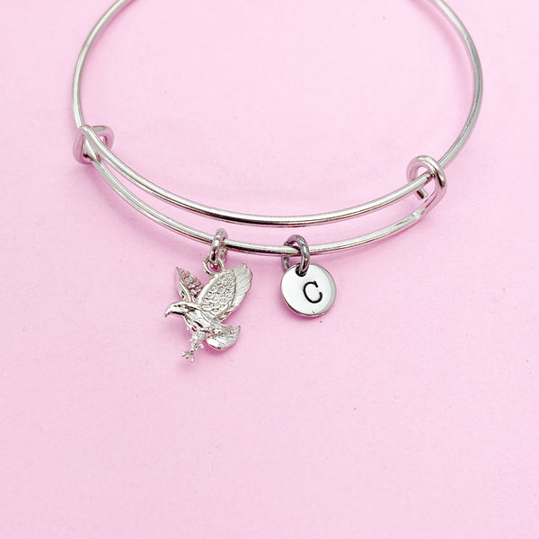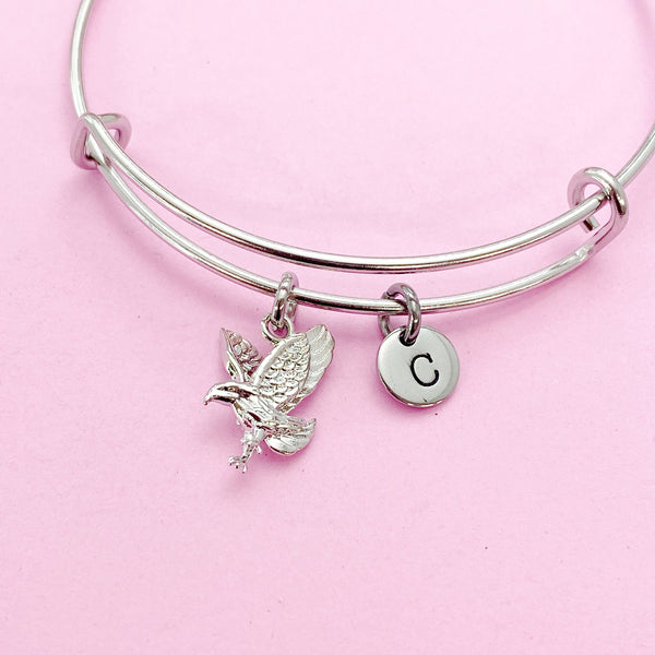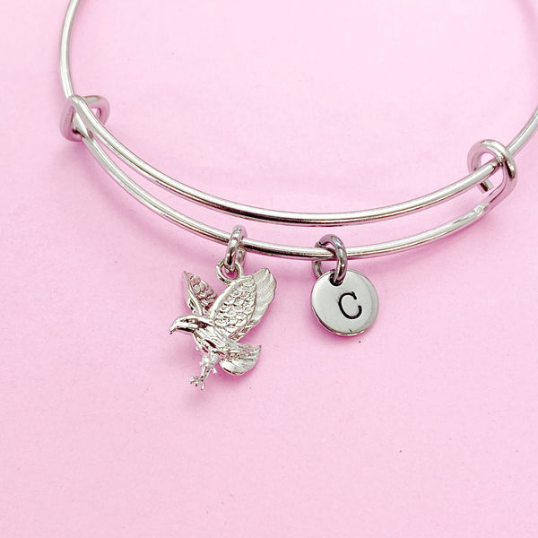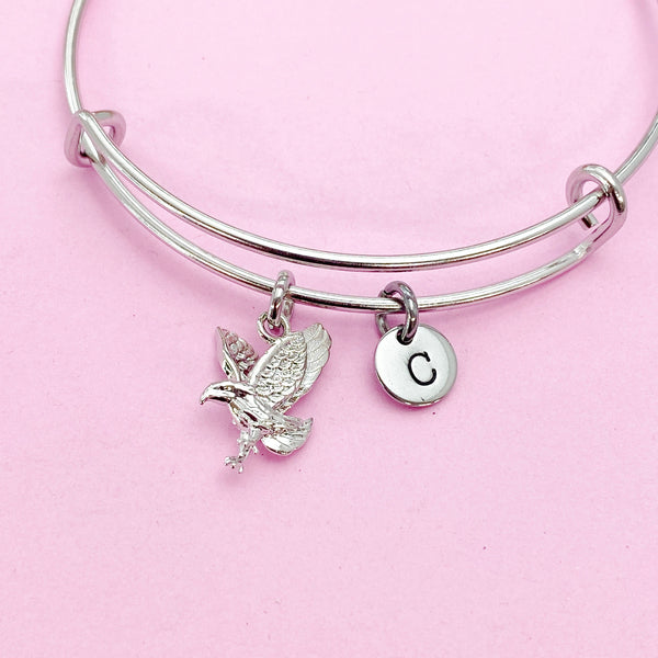 This is a silver-tone eagle charm with hand stamped initial charm on stainless steel bracelet.