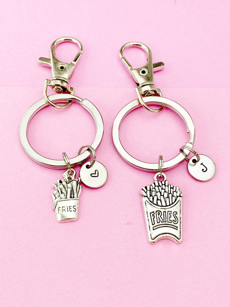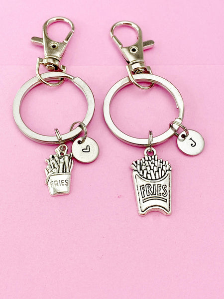 This is a silver-tone French Fries charm with hand stamped initial charm on keyring.