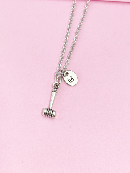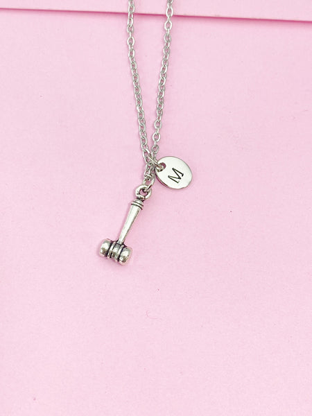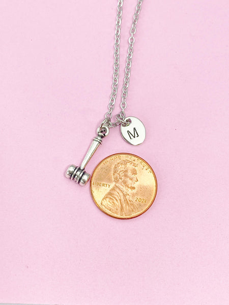 This is a silver-tone Gavel Hammer charm with hand stamped initial charm on stainless steel chain.