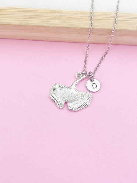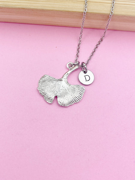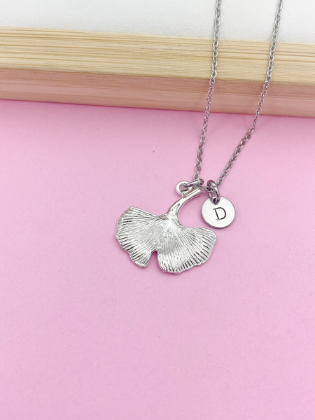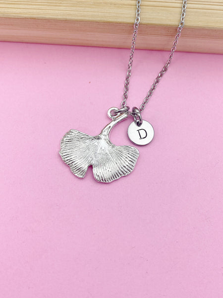 This is silver tone ginkgo, gingko leaf charm with hand stamped initial charm on brass/stainless steel 18 inches chain.
