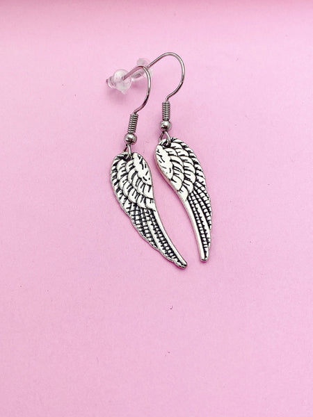 These are silver-toned Angel Wing charms with stainless steel ear hooks.