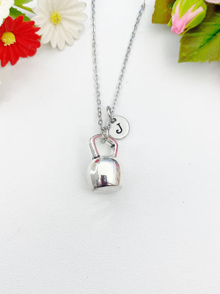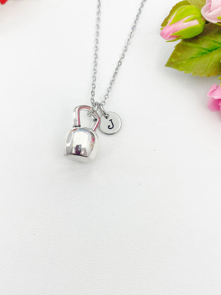 This is silver tone kettlebell charm with hand stamped initial charm on stainless steel 18 inches chain.