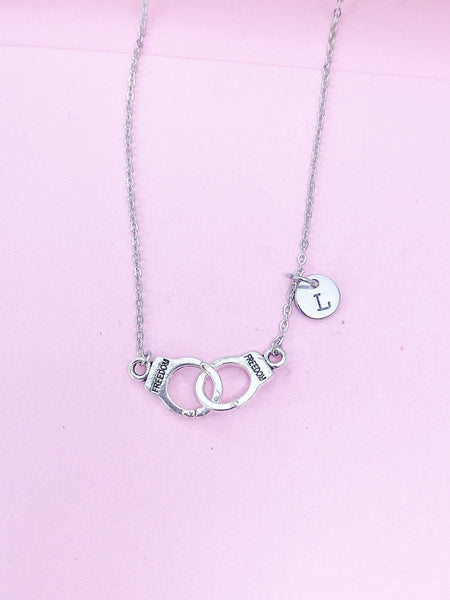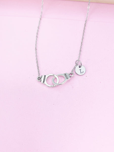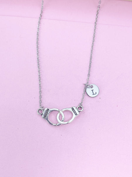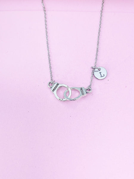 This is a silver-tone handcuff charm with hand stamped initial charm on brass or stainless-steel chain.