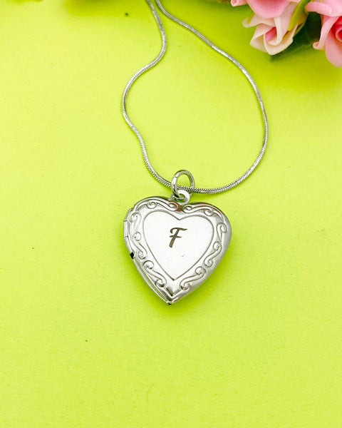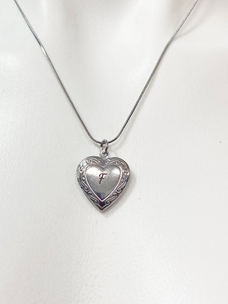 This is a unique engraving initial on stainless steel heart locket charm on 18 inches stainless steel necklace chain.