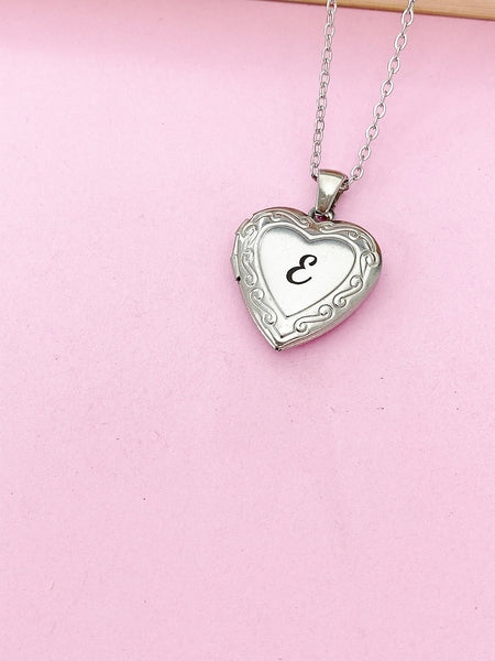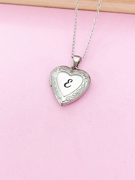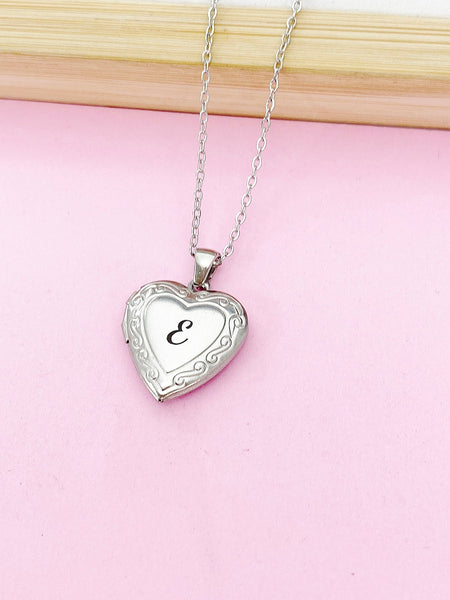 This is a unique engraving initial on stainless steel or brass heart locket charm on 18 inches stainless steel necklace chain.
