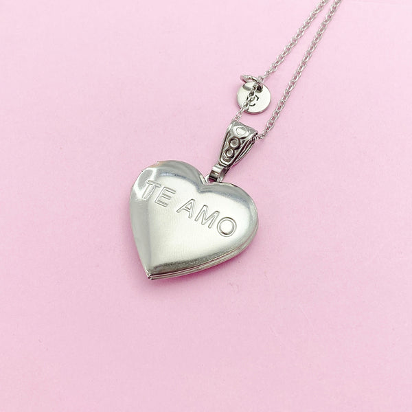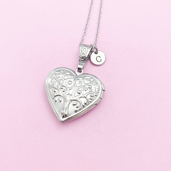 This is a silver-tone locket charm with hand stamped initial charm on stainless steel necklace.