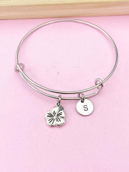 This is a silver-tone Hibiscus Tropical Flower charm with hand stamped initial charm on Tarnish Resistant stainless steel bracelet.