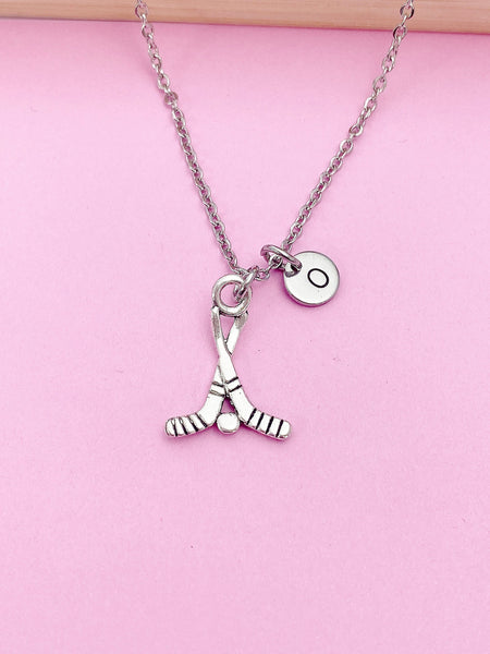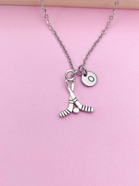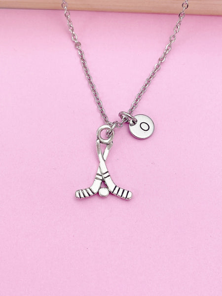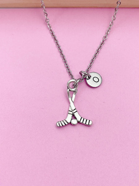 This is a silver tone hockey charm with hand stamped initial charm on stainless steel 18 inches chain.