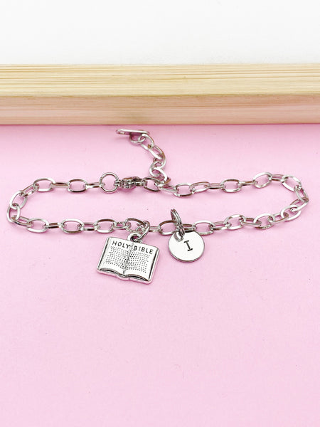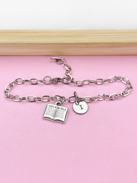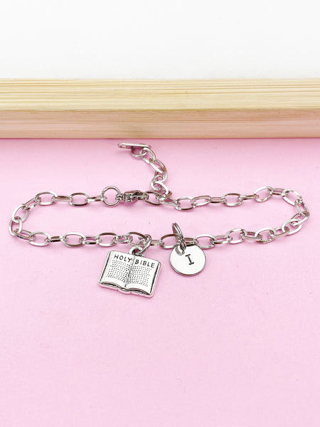 This is a silver-tone Holy Bible charm with hand stamped initial charm on Tarnish Resistant stainless steel chain.