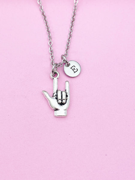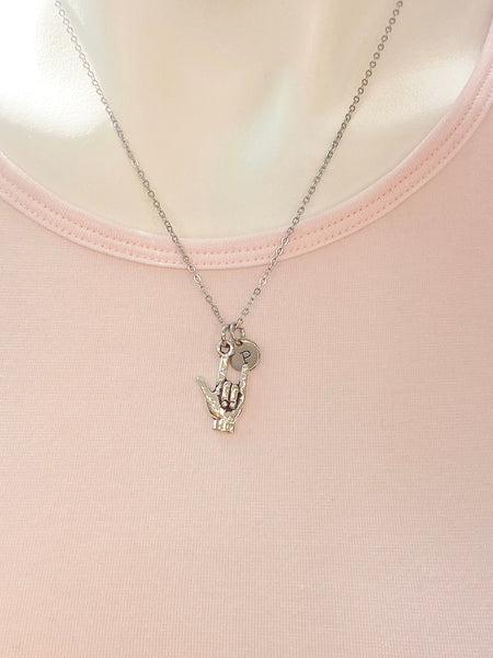 This is a silver ASL hand sign language charm with hand stamped initial charm on stainless steel 18 inches chain.