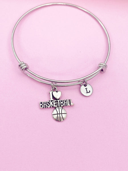 This is a silver -tone I heart basketball charm with hand stamped initial charm on stainless steel bracelet bangle.
