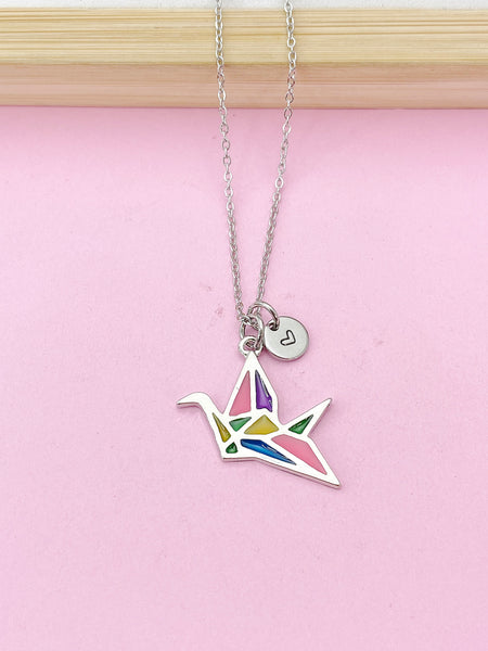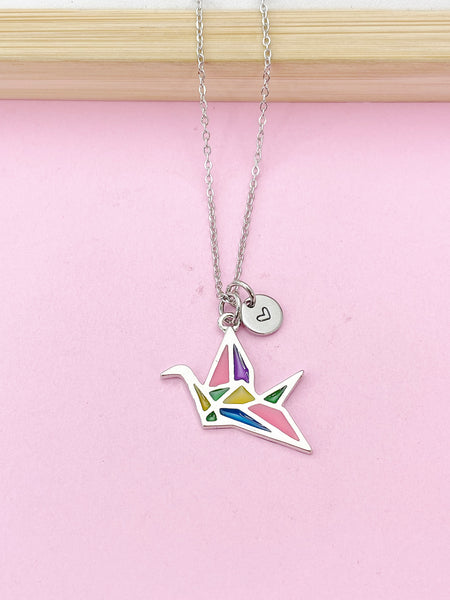This is a silver-tone Japanese Crane charm with hand stamped initial charm on brass or tarnish resistant stainless-steel chain.