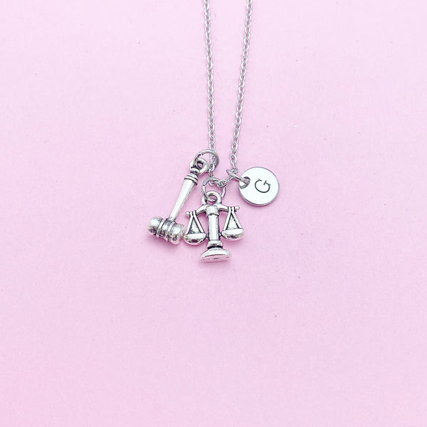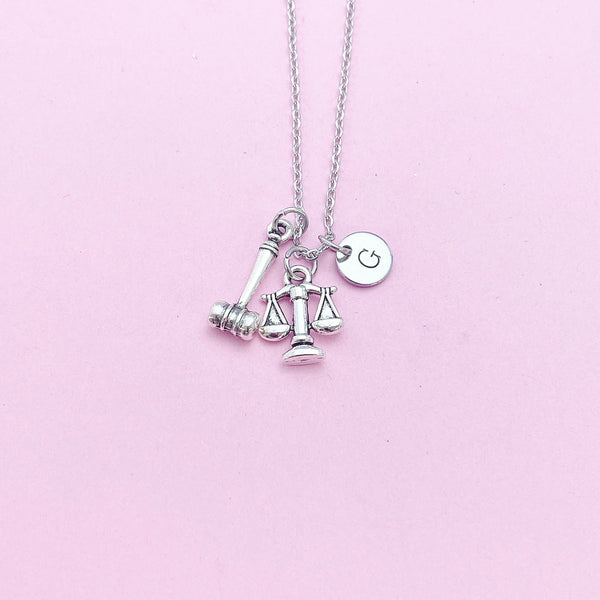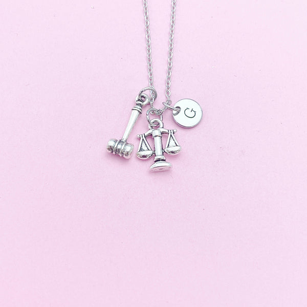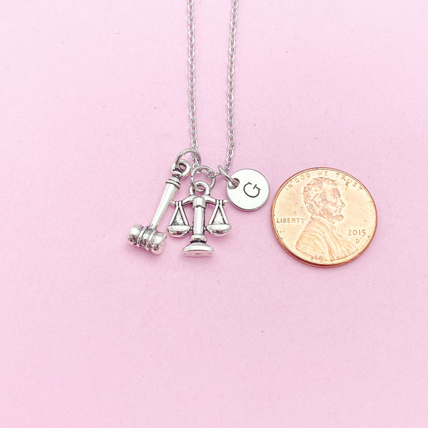 This is a silver-tone scales and gavel charm with hand stamped initial charm on brass or tarnish resistant stainless-steel chain.