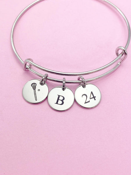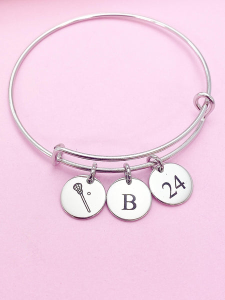 This is an engraving Lacrosse Initial and Number on stainless-steel charm on stainless steel bangle.