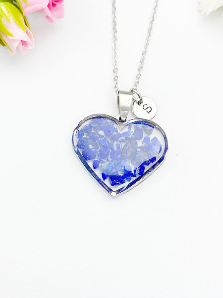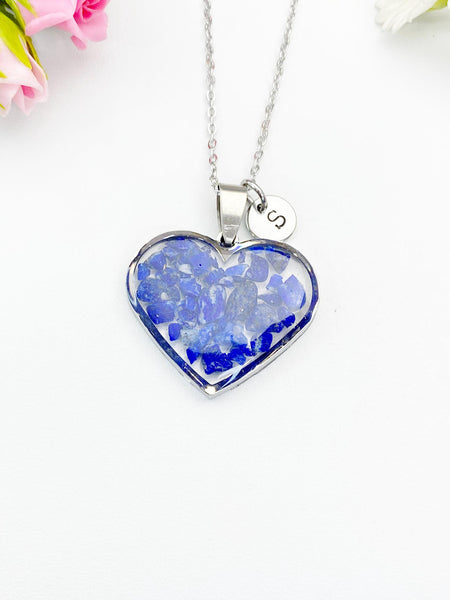This is gold tone Natural Lapis Lazuli charm with hand stamped initial charm on brass or stainless-steel chain.