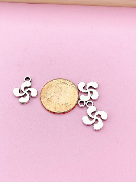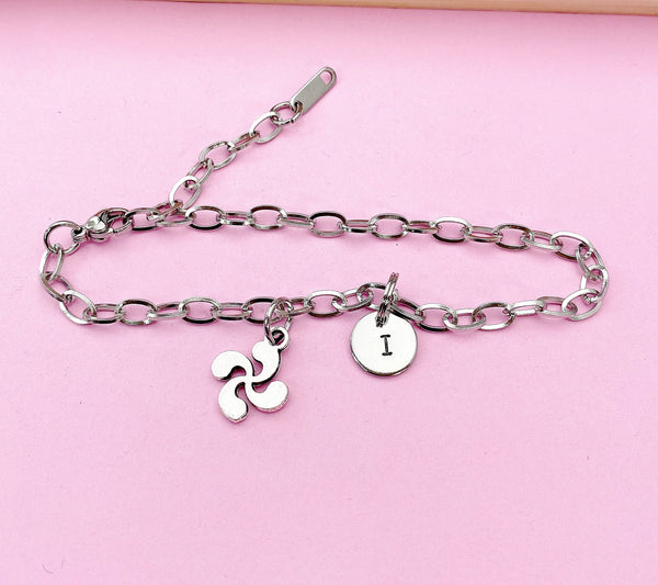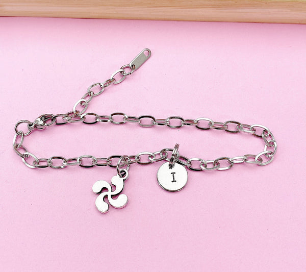 This is a silver-tone Lauburu Cross Basque charm with hand stamped initial charm on tarnish resistant stainless steel chain.