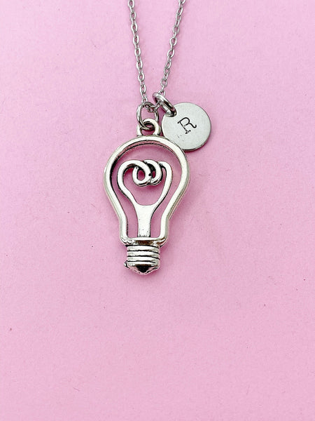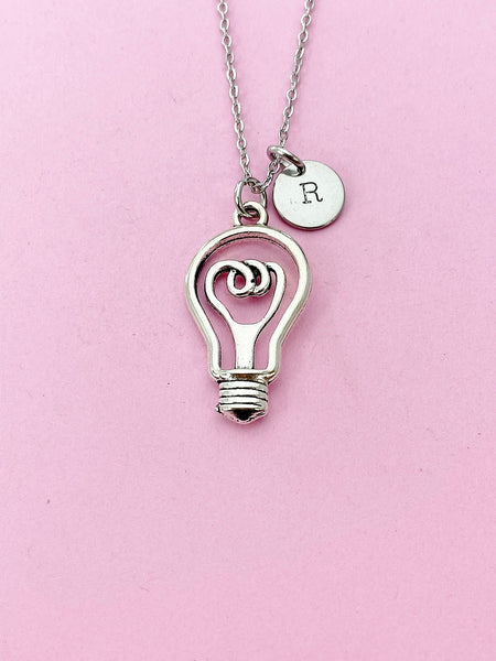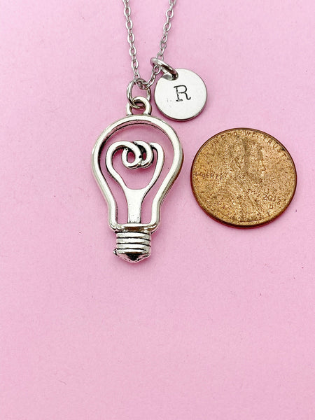 This is silver tone light bulb charm with hand stamped initial charm on brass or stainless-steel chain.