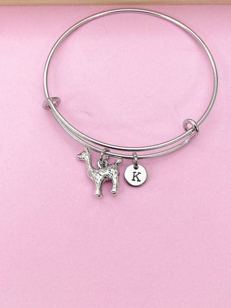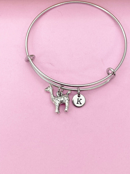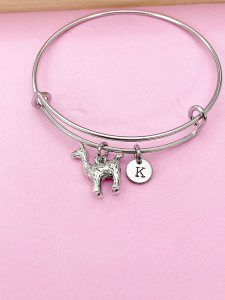 This is a silver-tone llama / alpaca charm with hand stamped initial charm on stainless steel bracelet.