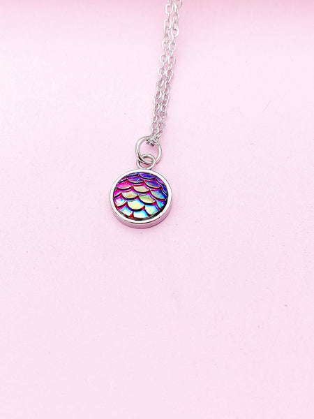 This is a silver-tone mermaid scale charm on stainless-steel chain.