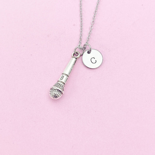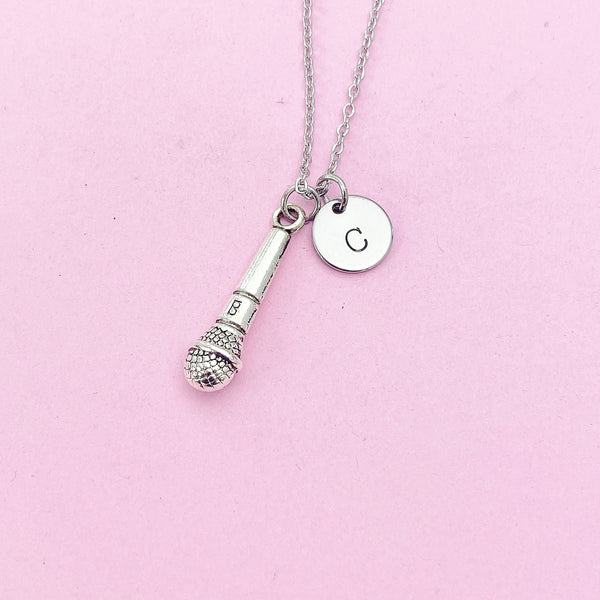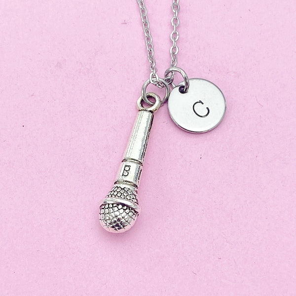 This is silver tone microphone charm with hand stamped initial charm on brass or stainless-steel chain.