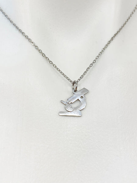 This is a stainless-steel Microscope charm with hand stamped initial charm on a stainless-steel chain.