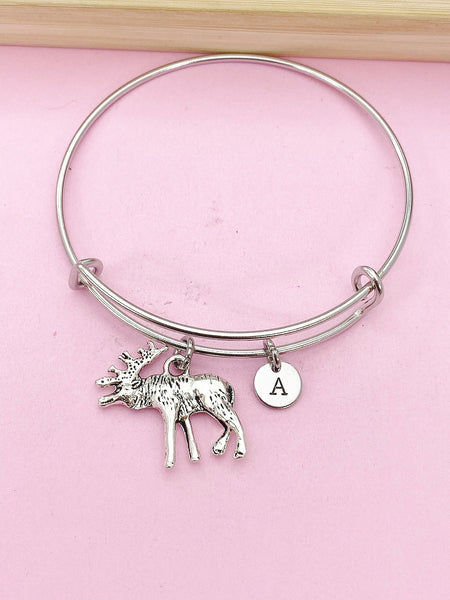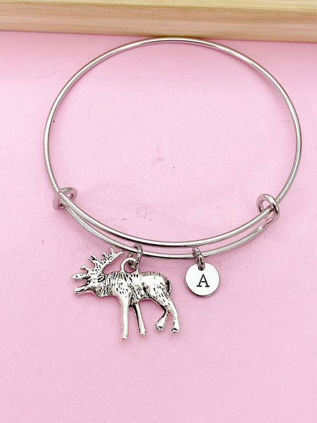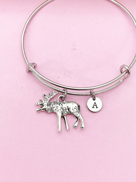 This is a silver-tone moose charm with hand stamped initial charm on stainless steel bracelet.