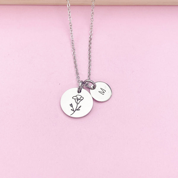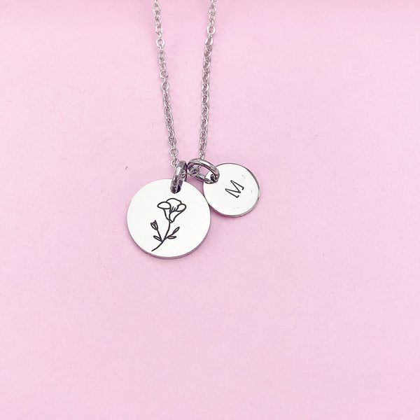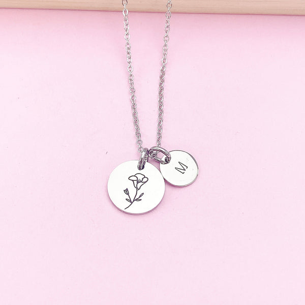 This is a silver-tone Morning Glory engraving on stainless steel charm with hand stamped initial charm on stainless steel necklace.