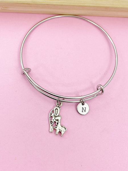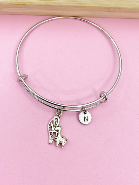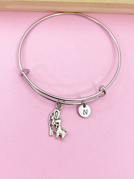 This is a silver-tone mother and baby giraffe charm with hand stamped initial charm on stainless steel bracelet bangle.