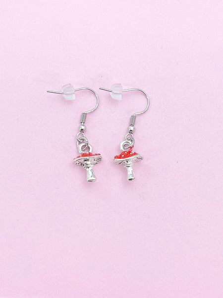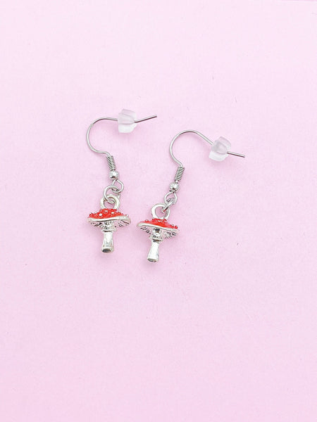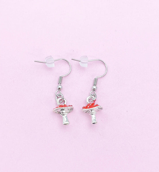 These are silver-toned mushroom charms with stainless steel ear hooks.