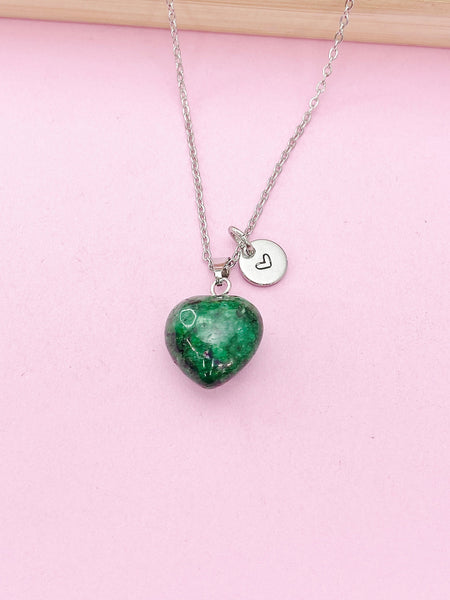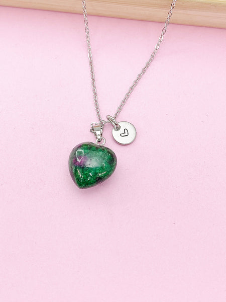 This is gold tone Natural Ruby in Zoisite charm with hand stamped initial charm on brass or stainless-steel chain.
