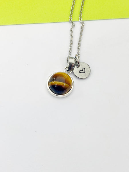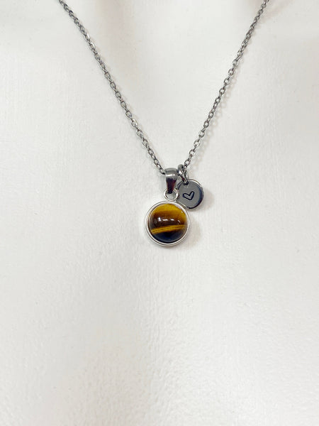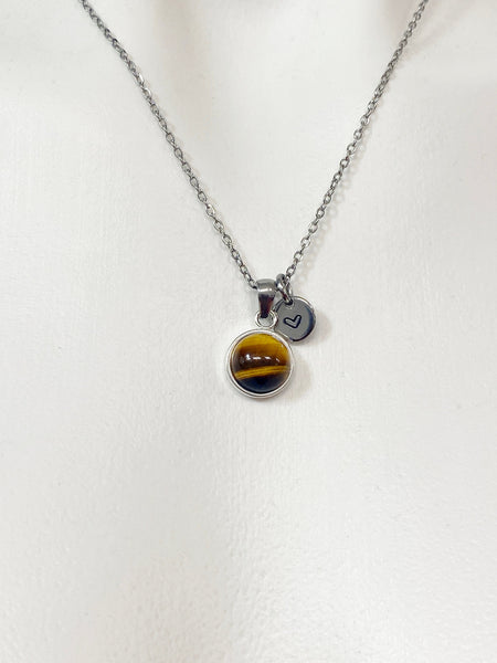 This is silver tone Tiger Eye charm with hand stamped initial charm on brass/stainless steel 18 inches chain.