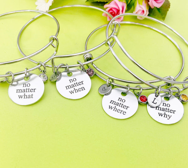 This is an engraving No Matter What or When or Where or Why on aluminum with hand stamped initial and birthstone charm on stainless steel bangle or necklace or split key ring optional.