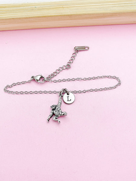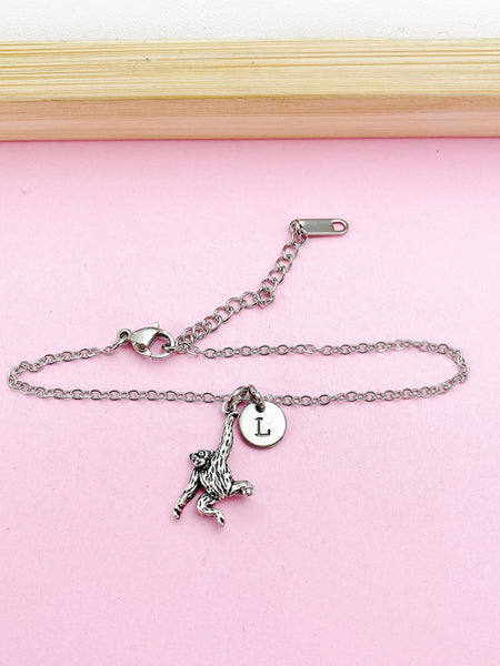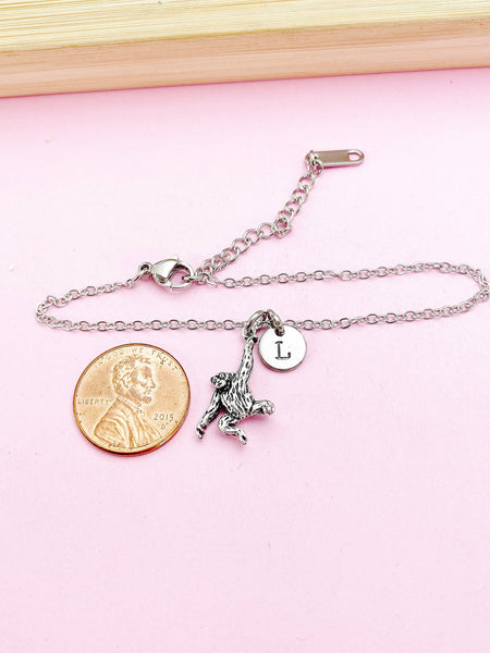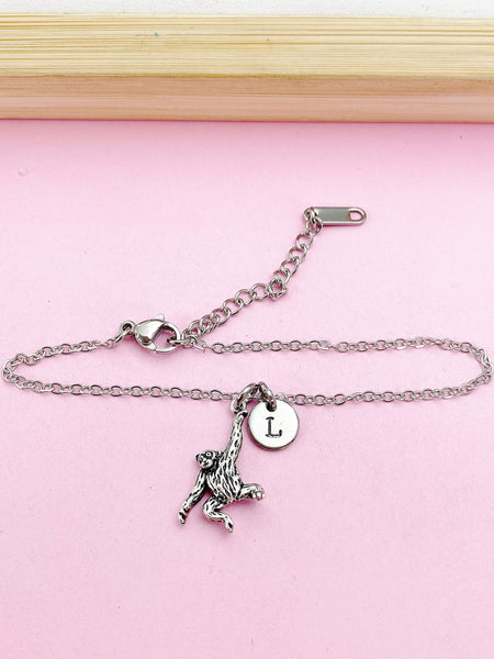 This is a silver-tone Orangutan monkey charm with hand stamped initial charm on stainless steel chain.