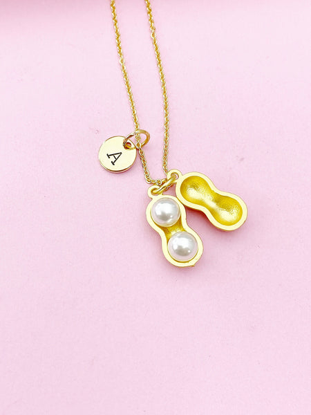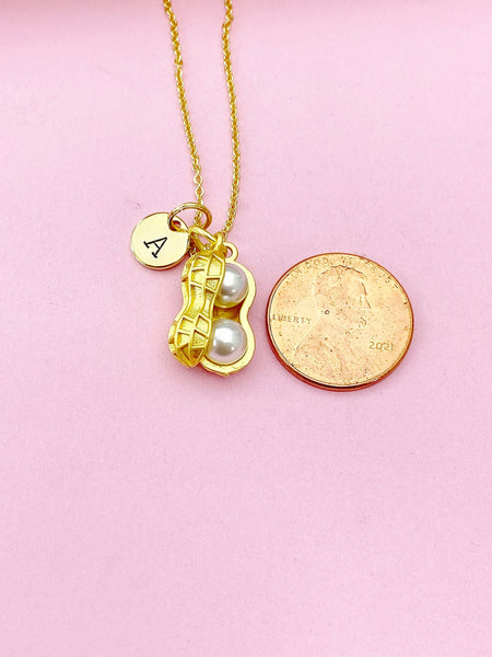 This is a gold -tone Peanut charm with hand stamped initial charm on brass/stainless steel 18 inches chain.