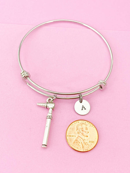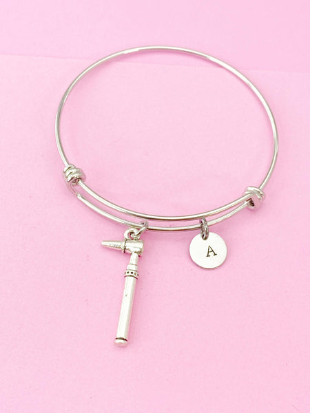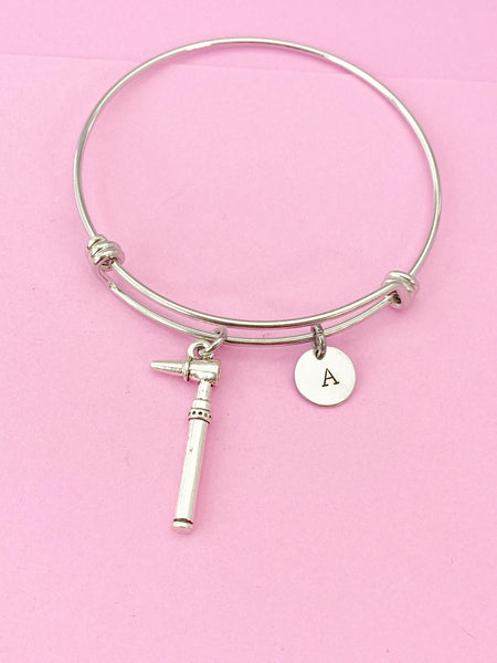 This is a silver-tone otoscope charm with hand stamped initial charm on Tarnish Resistant stainless steel bracelet.