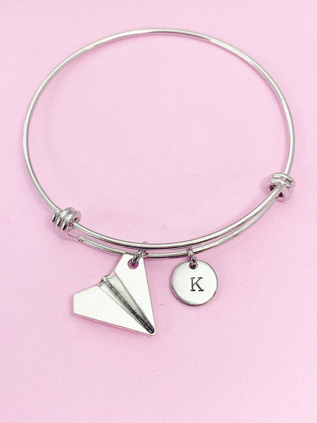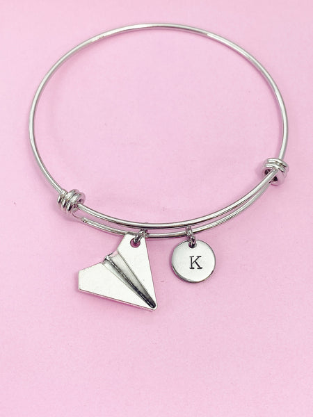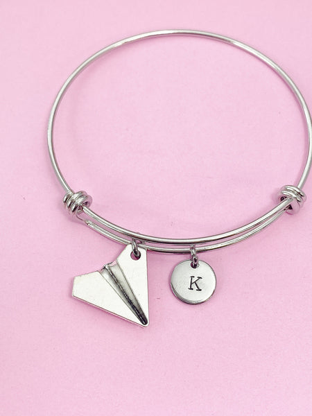 This is a silver-tone paper plane charm with hand stamped initial charm on stainless steel bracelet.