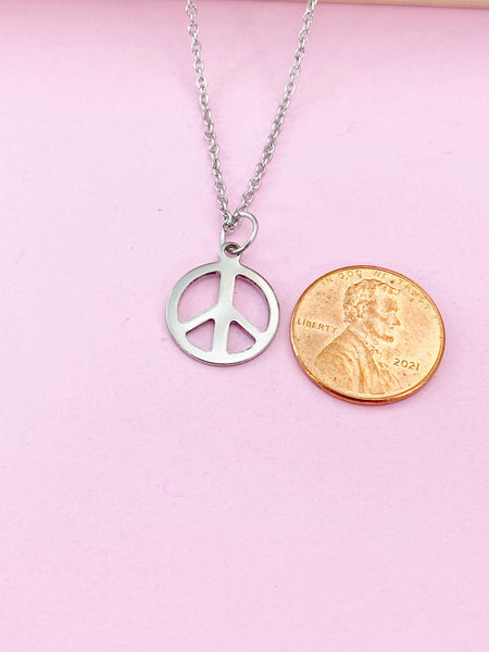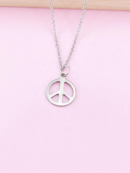 This is a silver-tone peace charm on tarnish resistant stainless-steel chain.