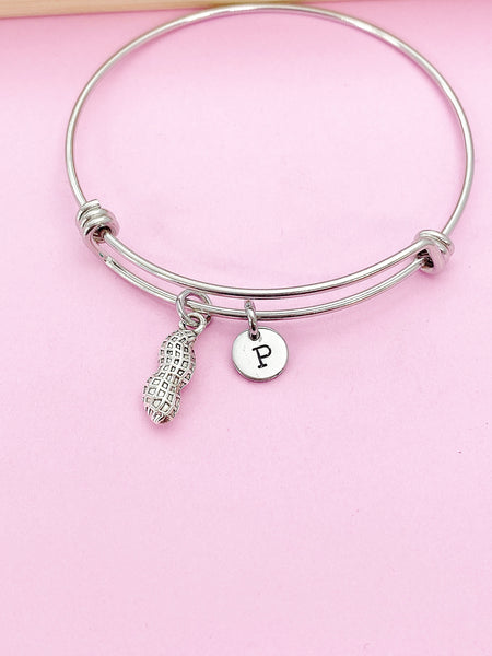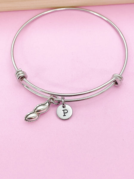 This is a silver-tone peanut charm with hand stamped initial charm on stainless steel bracelet.